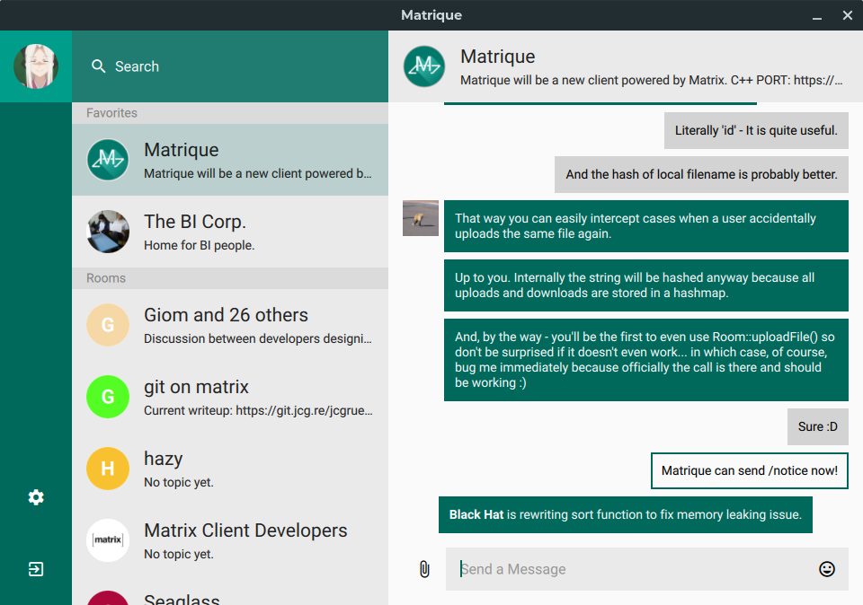 Matrique now has support for sending/receiving messages (plaintext, markdown, HTML, rainbow), emotes and notices. It also supports receiving images, videos, files and states. I am still working on file receiving functions.