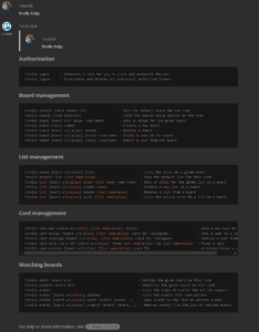 matrix-trello-bot has received quite the overhaul. It's gone from a small bot that had pre-determined notifications for board activity to a much more capable bot. The bot now supports managing boards (yes, you can create a board from within Matrix!), lists, and cards including creating, moving, archiving, assigning, and querying.