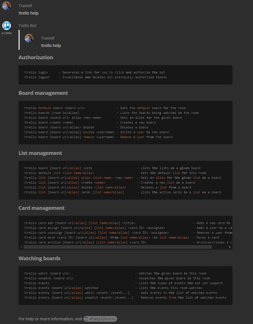 On top of all that, the bot respects that not every room will want to receive every possible notification and offers commands to pick and choose which events it should notify about on a per-board basis. Feel free to give it a spin and check out the massive help menu with