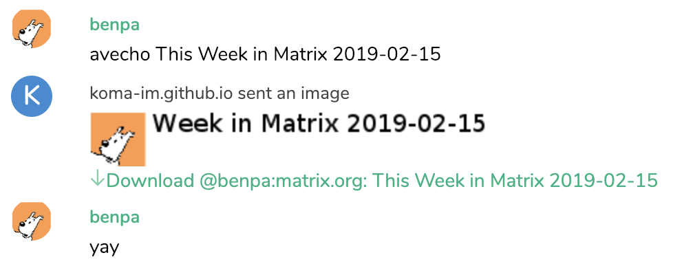 a new bot avecho is created using the koma-library. It's a simple bot that echos text messages prefixed with avecho, but renders it into an image and include the sender's avatar.