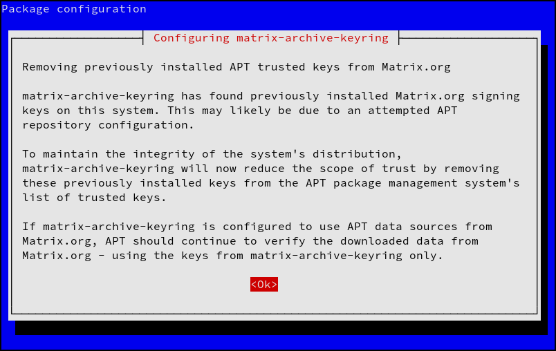 - A post-install script to remove any previously added Matrix.org package signing keys from