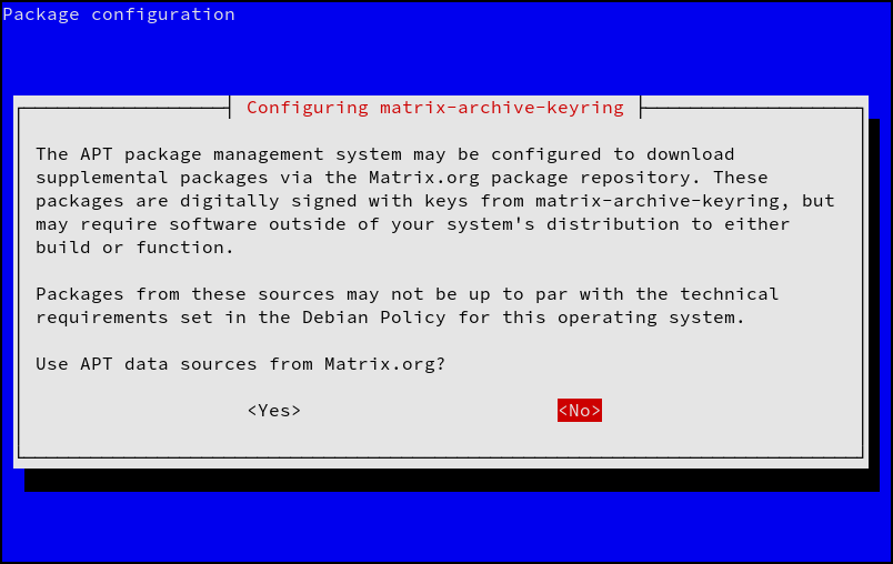 directly. I attempted the latter with my first PR; but that would've allowed the Matrix.org signing key to also be used to verify packages from Debian's main repositories. Yikes!)
