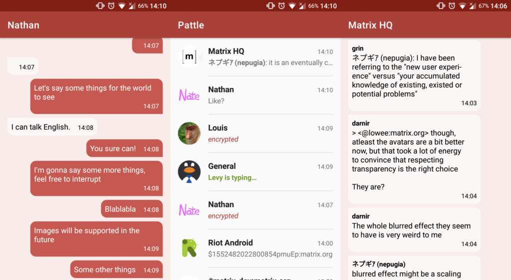 Hey all, I've been working on my Matrix Android app, Pattle! The goal of Pattle is to be an easy to use app for Matrix, with it's design inspired by popular apps such as WhatsApp and Telegram. Development happens here, and contributions are encouraged! The app is not currently suited for daily use, but some functionality is there, such as registering, logging in and viewing chats. Currently it's an Android only app using the official Matrix Android SDK, but the plan is to support iOS and web too, in the future. There's also a sort of design document available, stating how Pattle differs from standard Matrix apps and what it's goals are. The intent of the design document is to make development easier later on for other platforms