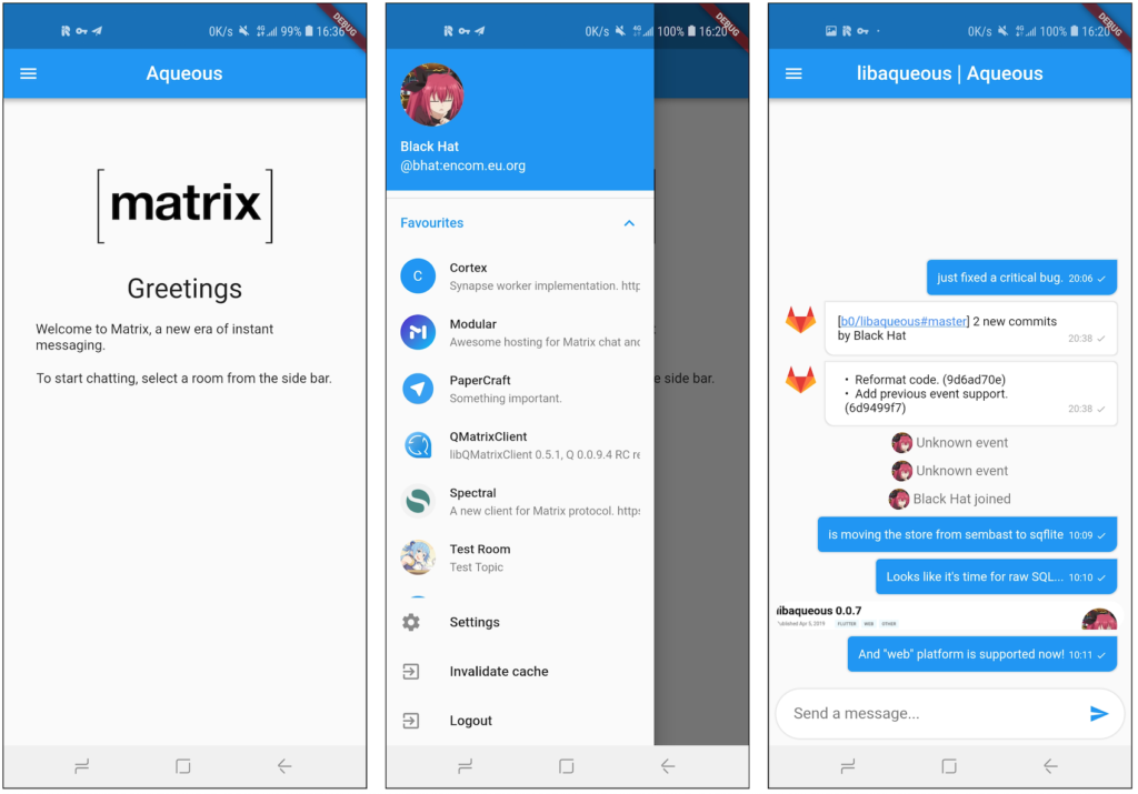 Black Hat is continuing work on libaqueous, a Matrix Dart SDK.