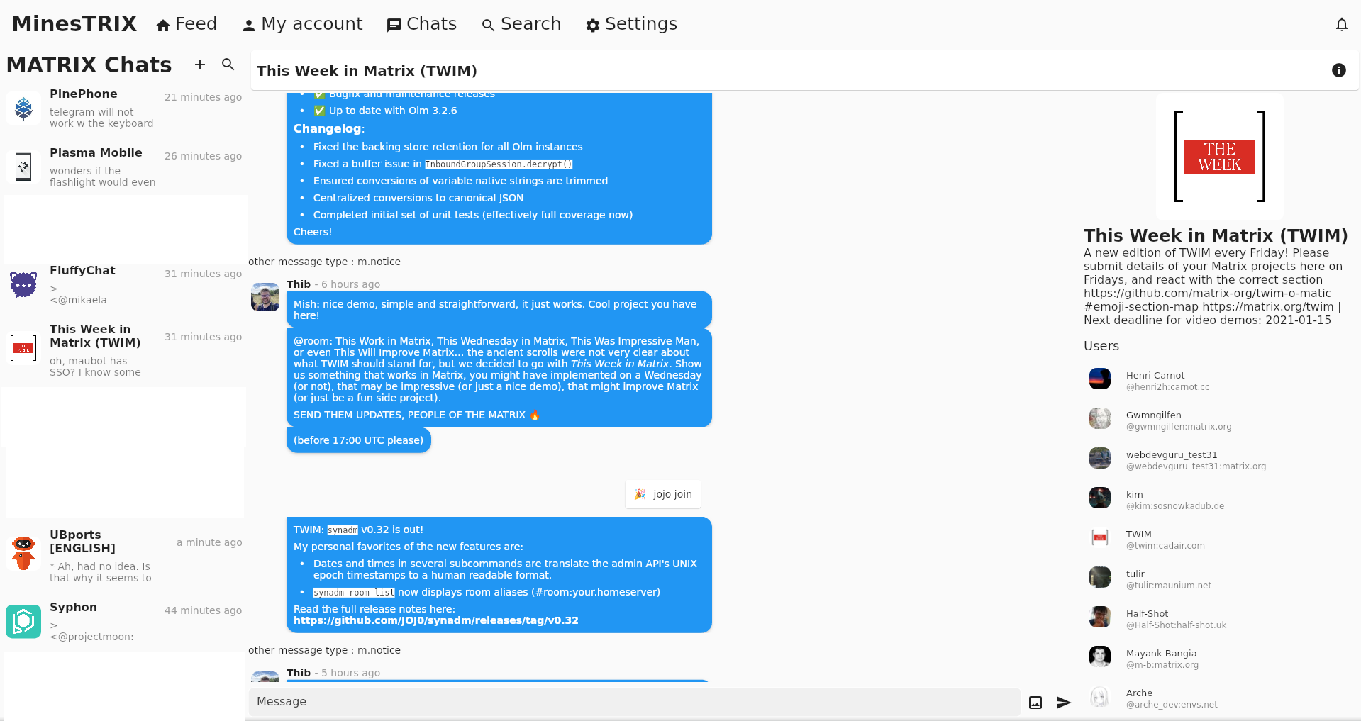 Quick update on MinesTRIX (a privacy focused social media based on MATRIX). This week was focused on performance and stability.