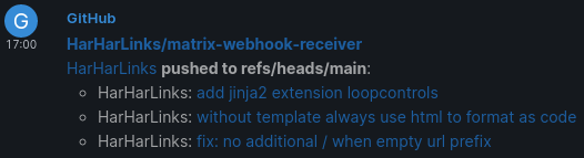 For example, here is the GitHub webhook as seen in #matrix-webhook-receiver:matrix.org: