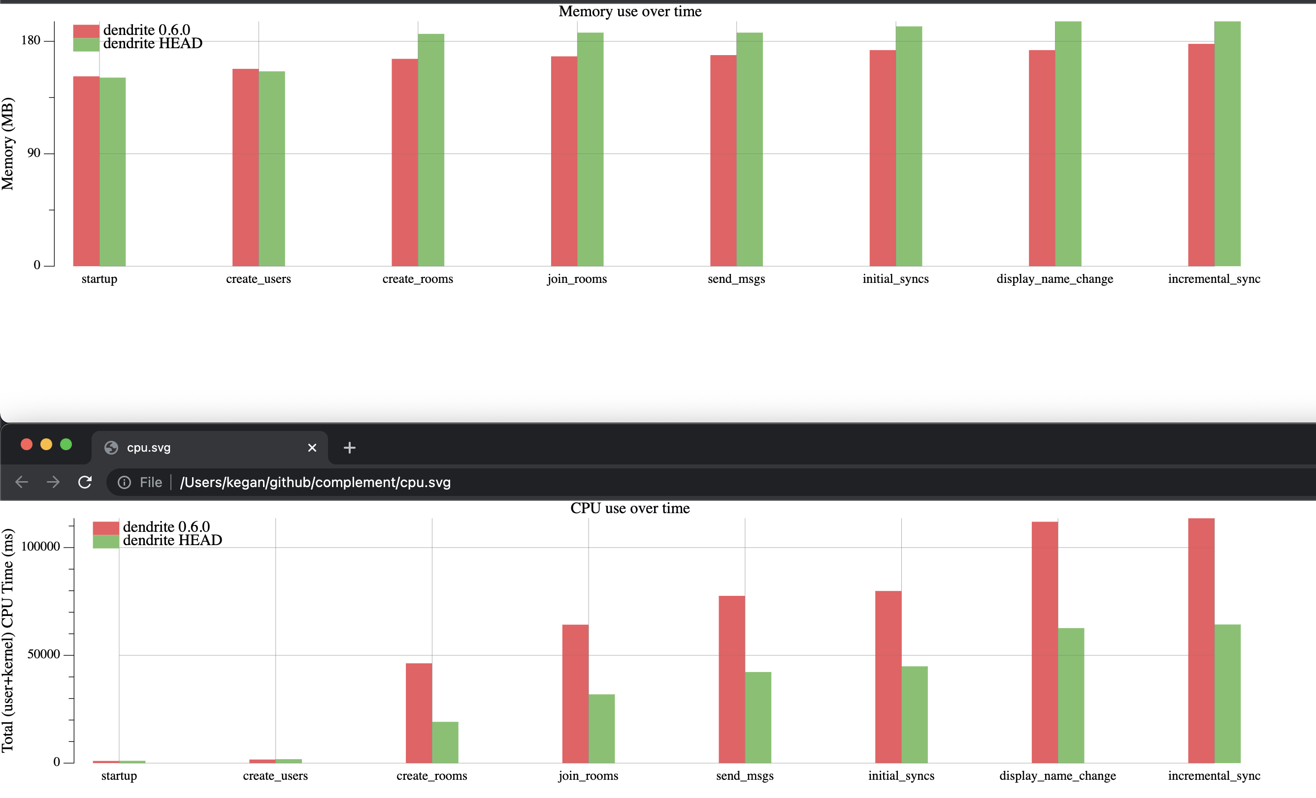This was a surprising find and probably indicates that Dendrite has a memory leak somewhere when creating events. However, the fun doesn't stop there. We can also use this tool to compare different versions of the same homeserver: