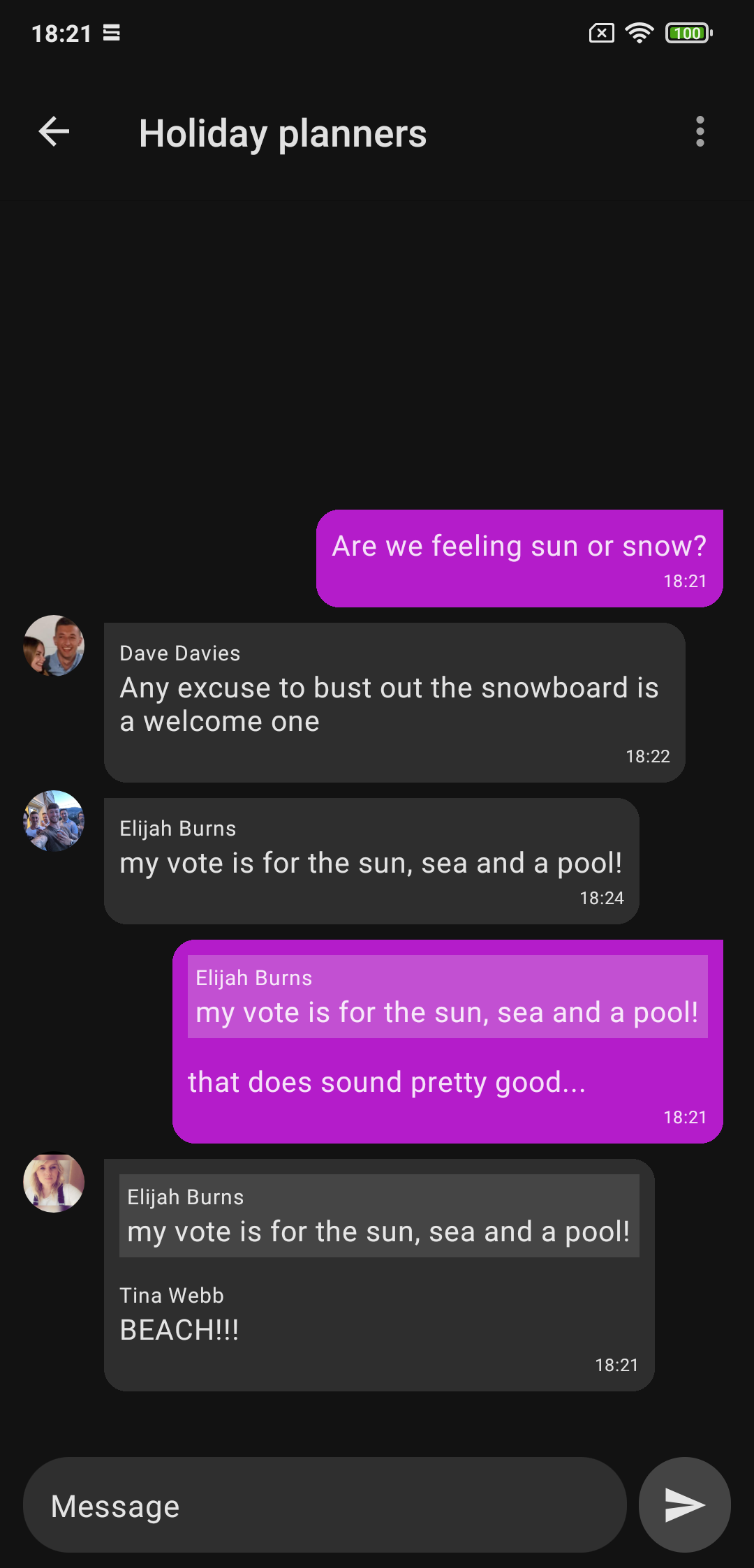 - Your messages are on the opposite side of messages sent by other users.