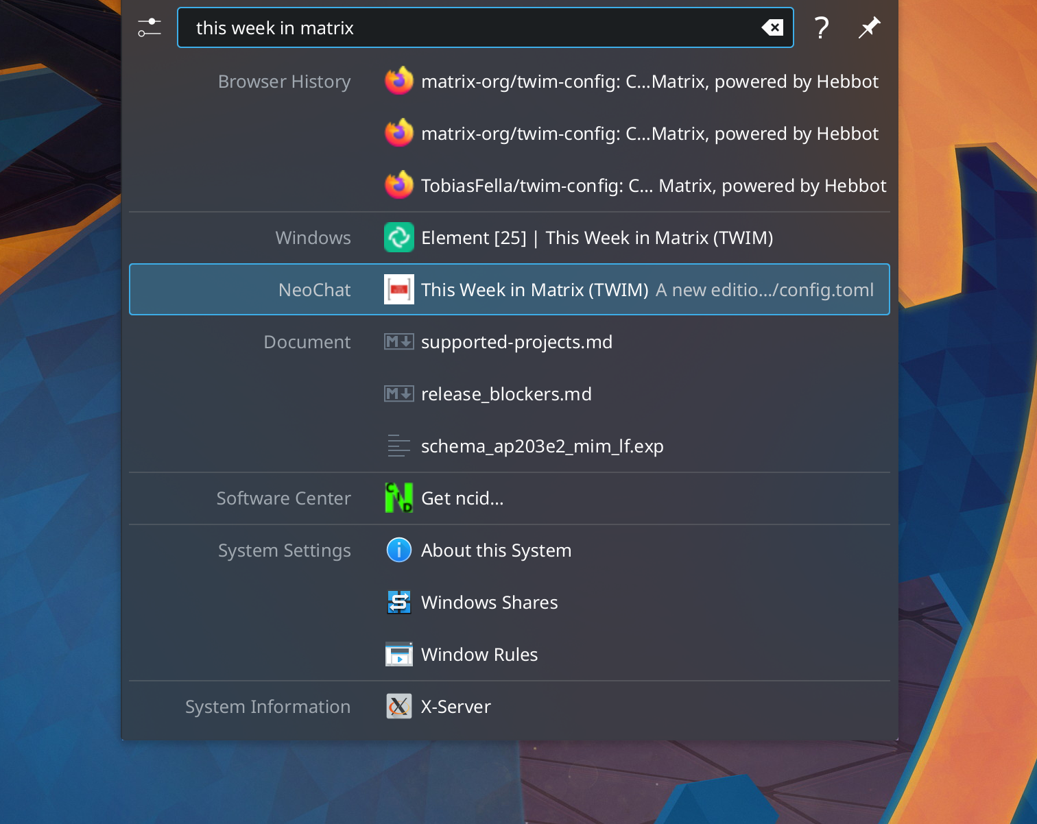 NeoChat now has a KRunner plugin thanks to work done by Nico (not the one from Nheko π). This allows plasma users to search for and open matrix rooms directly from their desktop. You will be able to enable it from the KRunner settings after the next release.
