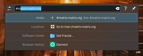 nheko-krunner has finally been released! Version 0.1.0 contains several handy features such as searching your rooms, joining new rooms, and starting and switching to direct chats. Furthermore, if a room has unread notifications, nheko-krunner will let you know by tacking on a notification count to the room name (e.g.