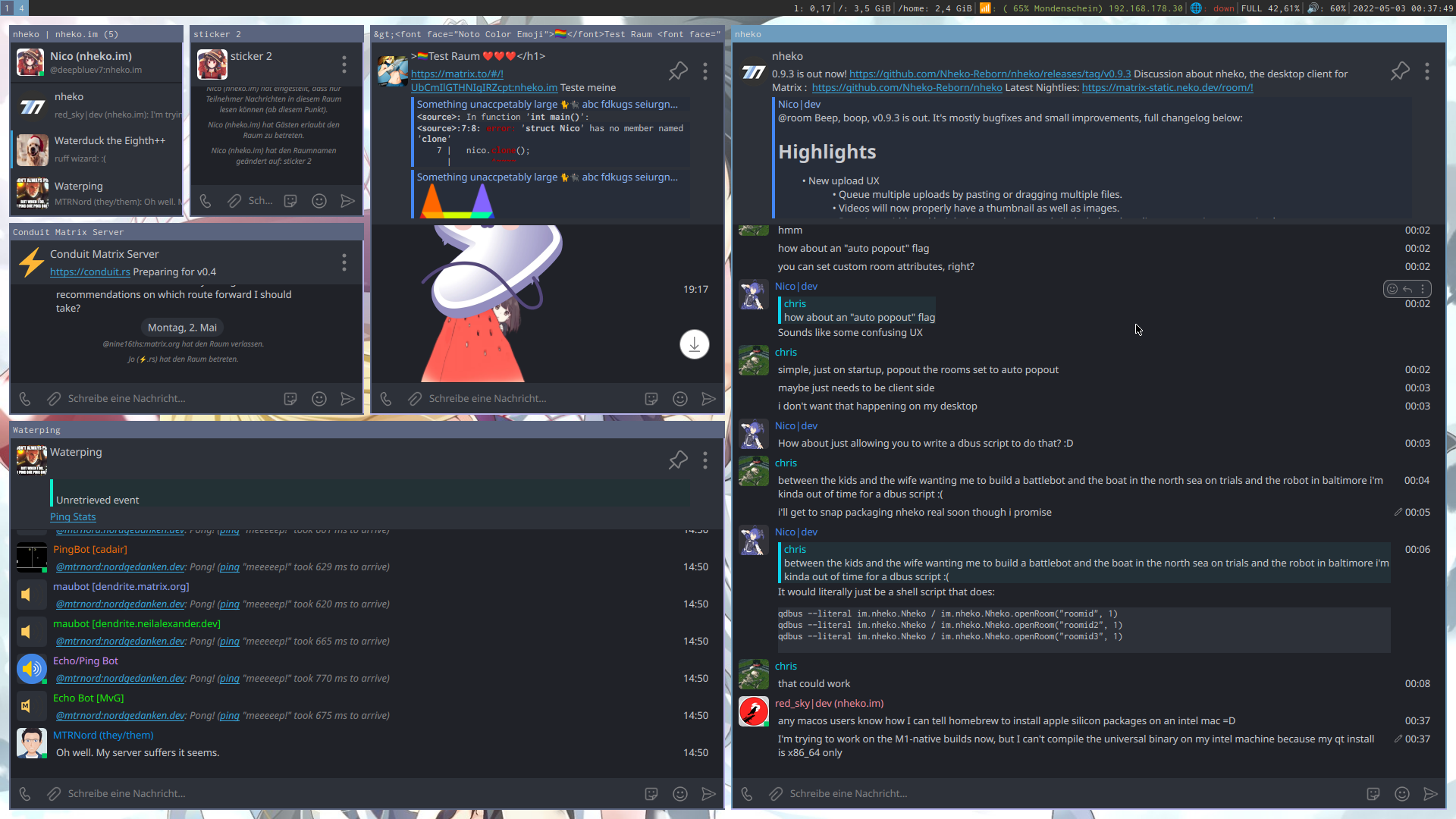 Bulbu also went through a lot of effort to add a second set of emoji shortcodes to Nheko. Those should be more familiar to people coming from other platforms or clients while the old shortcodes are available still as well. We also saw a lot of progress on the Finnish, Chinese, Indonesian and Russian translations, animated images should work properly in the image viewer again, buttons for opening the member list are now clearly marked with a people icon next to them. The memberlist is also now search- and sortable.