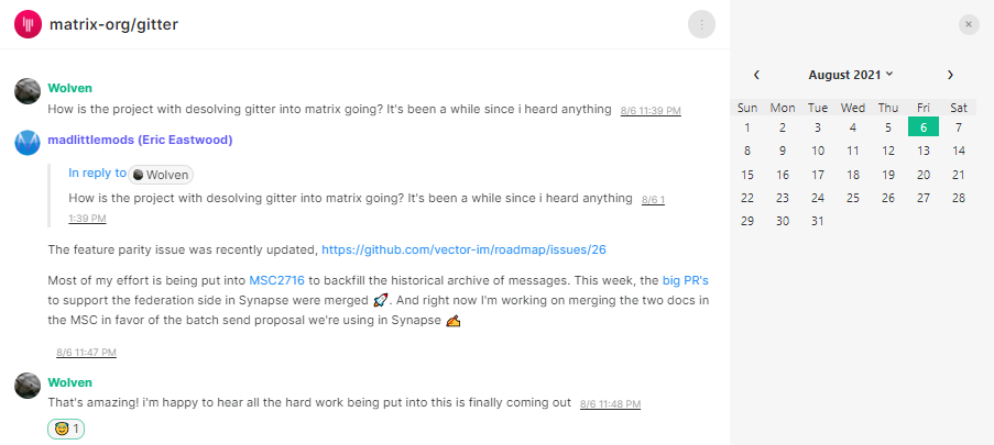 This week I'm showing off an early look at the Matrix public archive. As the name suggests, it acts as an archive of history for your world-readable Matrix rooms. This allows you to view historical content day-by-day and jump back years ago to see what your Matrix room was up to.