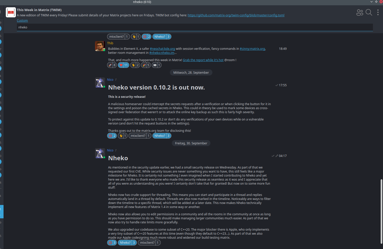 Nheko is participating in the yearly hacktoberfest once more and as a result we got quite a few fixes ranging from makig colors easier to configure over crash fixes to grammar and code quality fixes. If you always had something you wanted to contribute to Nheko, now is a good time if you want someone to plant a tree for you (or if you want a T-Shirt and don't care about the environment...).