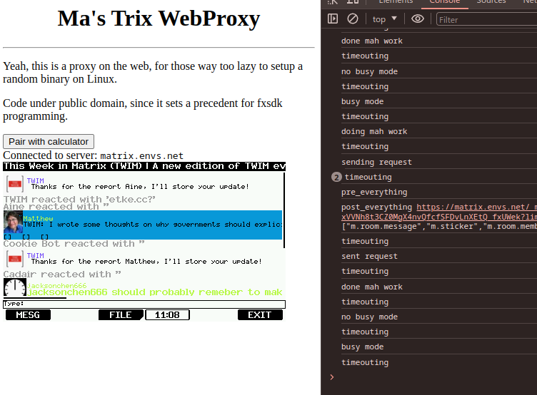 Just started making a (simple) client in C recently for fun, Ma's Trix. It's really bare-bones and crashes sometimes, but overall been quite fun to write everything out myself!